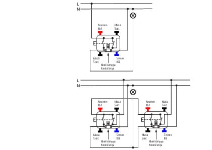 Uppoasennettava vaihtokytkin merkkivalolla. Merkkivalo palaa kun virtapiiri on kytkettynä. Jousiliittimillä max. 2,5 mm²:n johdoille. Liittimiin voi kytkeä max. 2 johdinta. Kytkinrunko ja vipu.