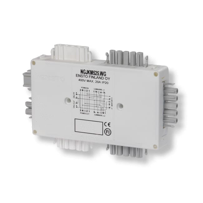 Kytkinrasia NGJKM525.WG on tarkoitettu valaistuksen väyläohjaukseen. Kotelossa on kolmivaiheinen läpimenevä syöttö. 2-napaisilla liittimillä sisäänmeno ja ulostulo väyläohjaaville kytkimille tai liiketunnistimille. Kolmelle valaisinryhmälle tehonsyöttö ja ohjaus 5-napaisilla harmailla liittimillä.