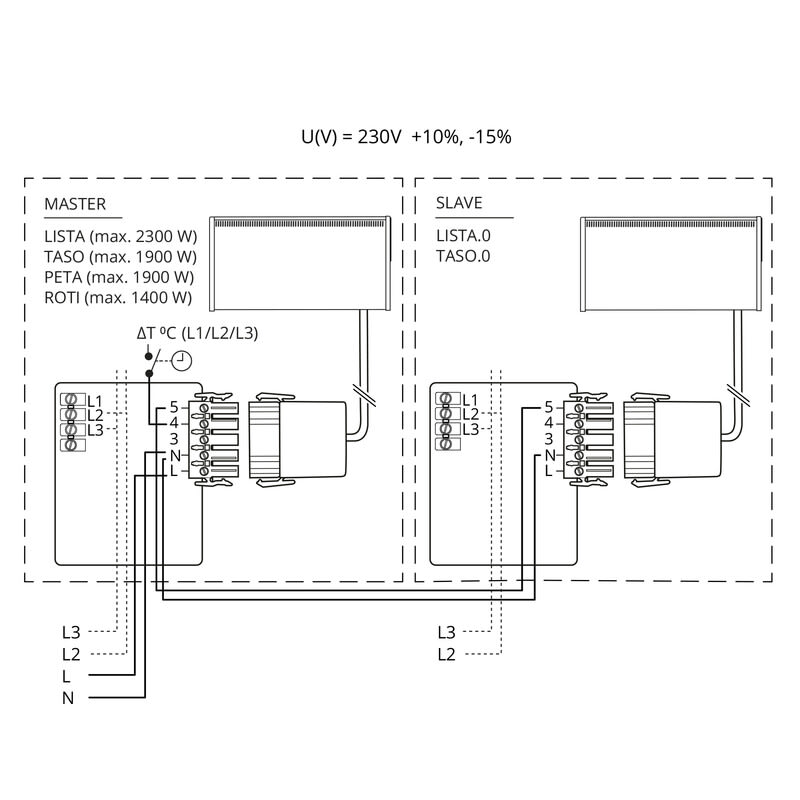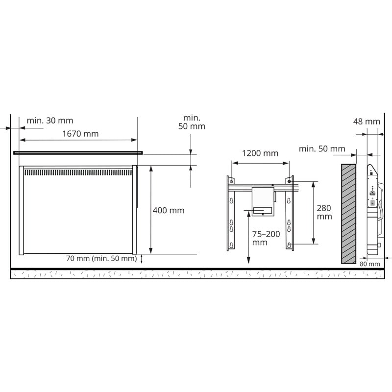 Kiinteästi asennettava Taso yhdistelmälämmitin 1200W/230V elektronisella termostaatilla ja kytkentärasialla. Väri vaalea, RAL9002. IP20. 400x1670mm.