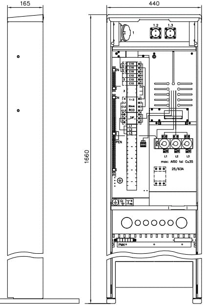 Moderni 2-tariffimittauskeskus yhdellä mittariristikolla, vikavirtasuojakytkimellä ja kuudella johdonsuojakatkaisijalla. Tilavaraus ylijännitesuojille EVL2.23. Mittaus ennen pääkytkintä. Keskuksessa on erillinen tila pistorasioille, jossa 2 kpl 1-vaiheisia ja 1 kpl 3-vaiheisia 16A pistorasioita, jotka on suojattu 30 mA vikavirtasuojakytkimellä. Keskuksen mukana toimitetaan myös 25 A päävarokkeet, pohjakoskettimet sekä vaihtokannet. Keskuksessa on kiinteä jalusta. Keskuksen väri RAL7035E. 50A