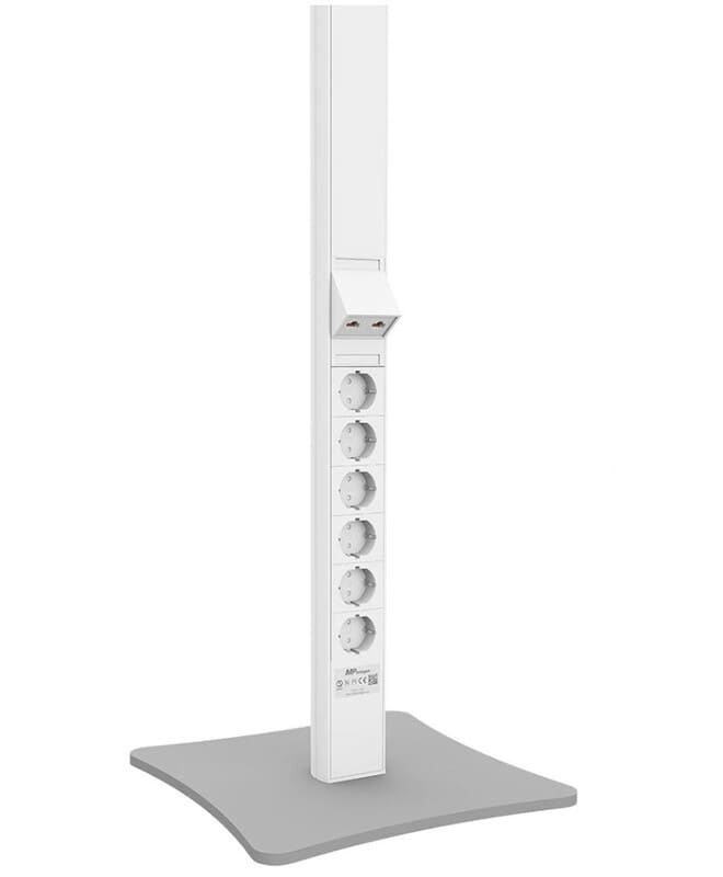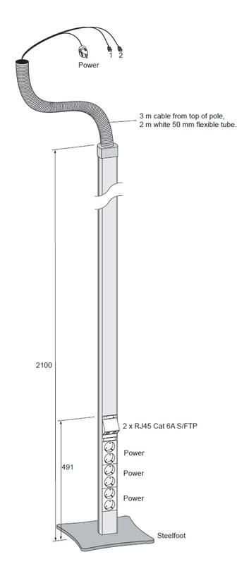 Laadukas FI-sertifioitu pistorasiapylväs työpisteelle. Suojaputki 2 m. Vapaa kaapelipituus n. 1 m. Jalusta (SSTL 1468588) ei kuulu toimitukseen.