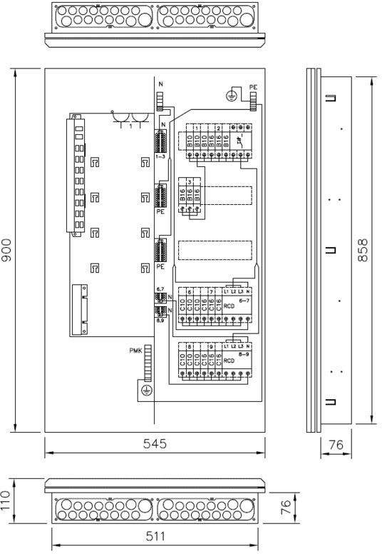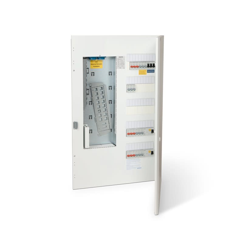 3-vaiheinen IT-ryhmäkeskus, jossa kaksi 4-napaista 30mA vikavirtasuojakytkintä, 21kpl johdonsuojakatkaisijaa ja 18 modulia varatilaa. Keskuksessa on helposti kytkettävät jousiliitäntäiset N- ja PE-liittimet. IT-tilassa on kaksi schuko-pistorasiaa sekä tilat antennihaaroittimelle tai -jaottimelle ja aktiivilaitteelle (esim. ADSL), paikat 20:lle RJ45-liittimelle ja irrotettava kuitukotelo, jossa on aihiot SC-duplex tai LC-quattro-liittimille.