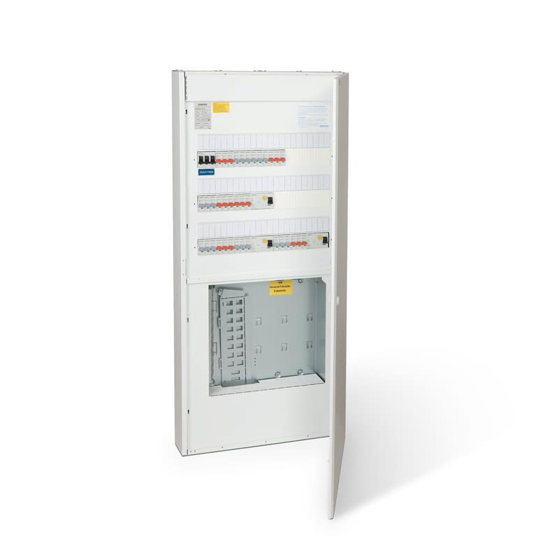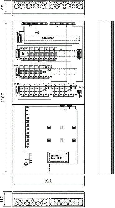 3-vaiheinen IT-perusryhmäkeskus, jossa kolme 4-napaista 30mA vikavirtasuojakytkintä, 36kpl jousiliitäntäistä johdonsuojakatkaisijaa ja 18 modulia varatilaa. Keskuksessa on helposti kytkettävät jousiliitäntäiset N- ja PE-liittimet. IT-tilassa on kaksi schuko-pistorasiaa sekä tilat antennihaaroittimelle tai -jaottimelle ja aktiivilaitteelle (esim. ADSL) sekä paikat 20:lle RJ45-liittimelle.