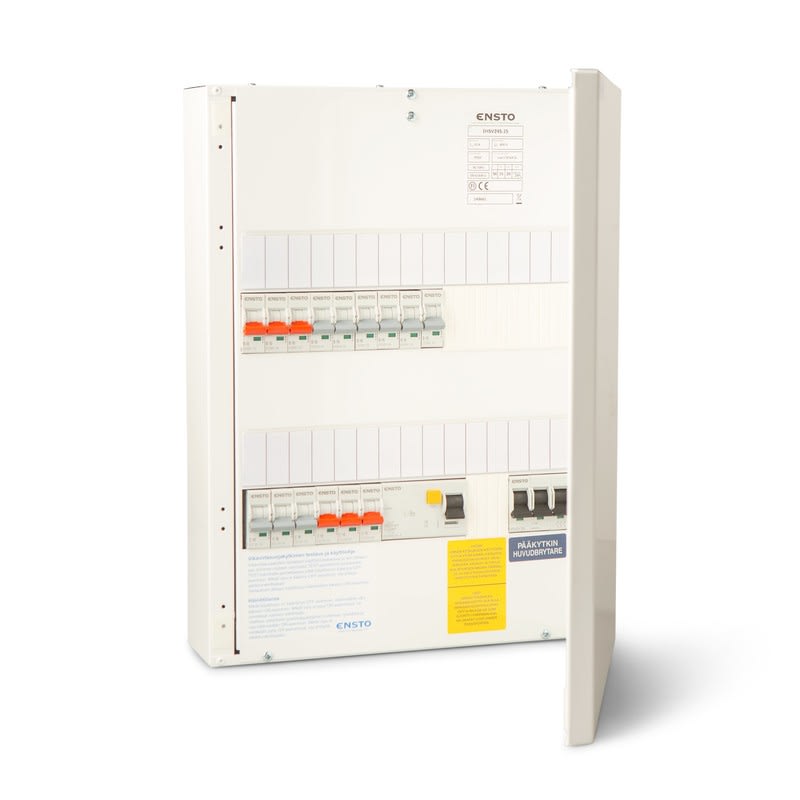 3-vaiheinen ryhmäkeskus pinta-/uppoasennukseen. Keskuksessa on yksi 4-napainen 30 mA vikavirtasuojakytkin sekä 15kpl johdonsuoja-automaattia.
