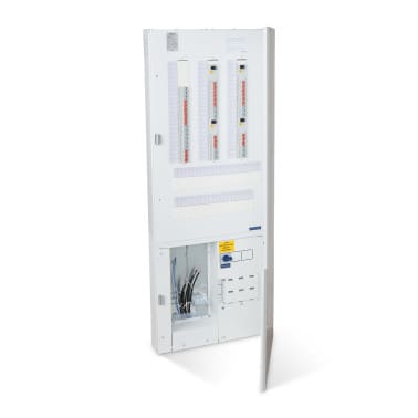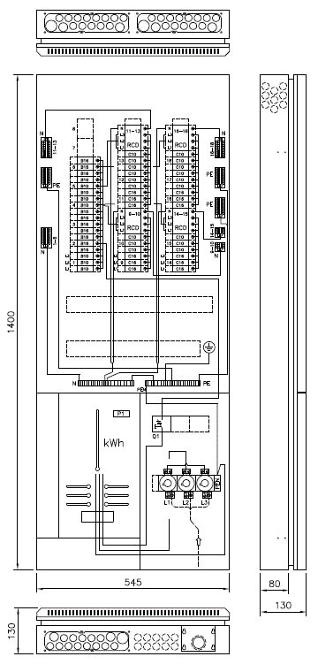 3-vaiheinen kuivan tilan mittauskeskus, jossa neljä 4-napaista 30mA vikavirtasuojakytkintä, 48kpl johdonsuojakatkaisijaa ja 58 modulia varatilaa. Keskuksessa on helposti kytkettävät jousiliitäntäiset N- ja PE-liittimet.