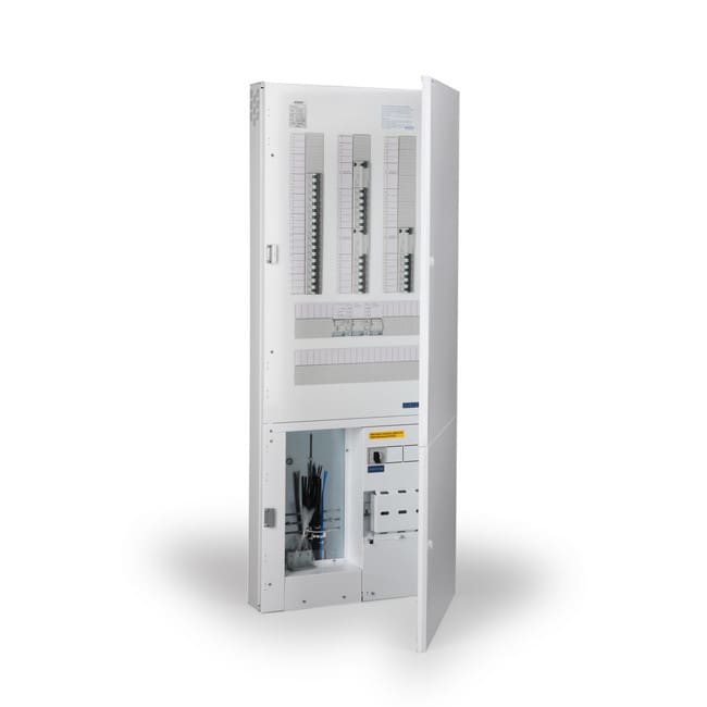 3-vaiheinen kuivan tilan mittauskeskus SLY-kytkennällä, jossa neljä 4-napaista 30mA vikavirtasuojakytkintä, 34kpl johdonsuojakatkaisijaa ja 70 modulia varatilaa. Keskuksessa on helposti kytkettävät jousiliitäntäiset N- ja PE-liittimet. Keskus on korvattu mallilla ESNV345.36.