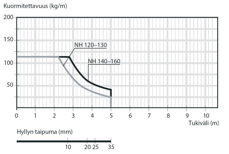 IEC 61537:n mukainen turvallinen työkuorma, kun tukiväli on 5,0 m.: