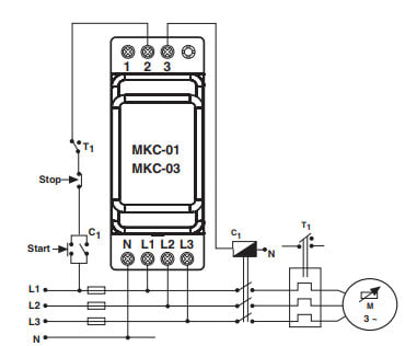MKC-03 3~230V Nollakatkos, Vaihekatkos, Väärä vaihejärjestys, Kiinteä epäsymmetria, Vaihtokosketin Toiminta: • Nollakatkos • Vaihekatkos • Vaihejärjestys • Jännite-epäsymmetria 40% (Kiinteä) • Hälytyskosketin • Laukaisuaika 0,2s • 3~ + N (230V AC 50/60 Hz) • Toiminta-alue ±10% Un