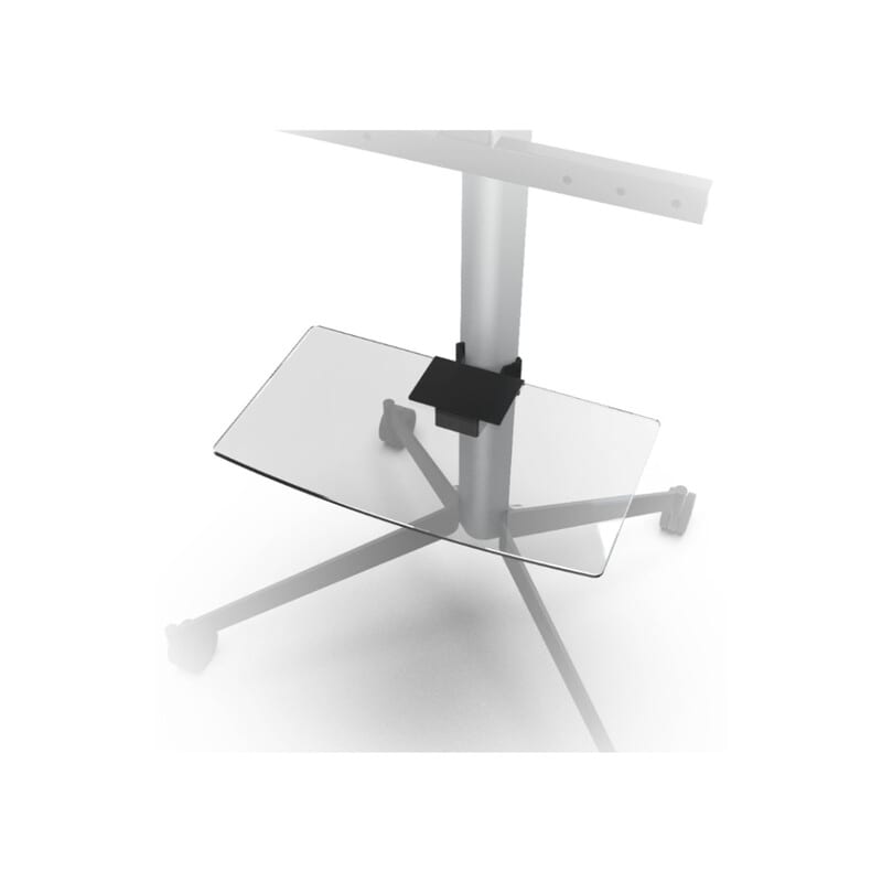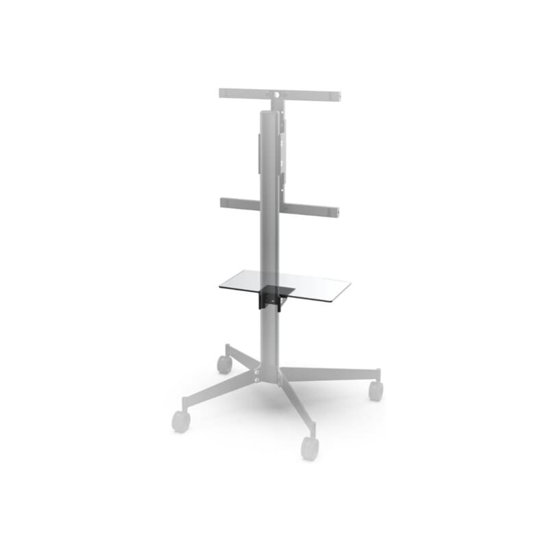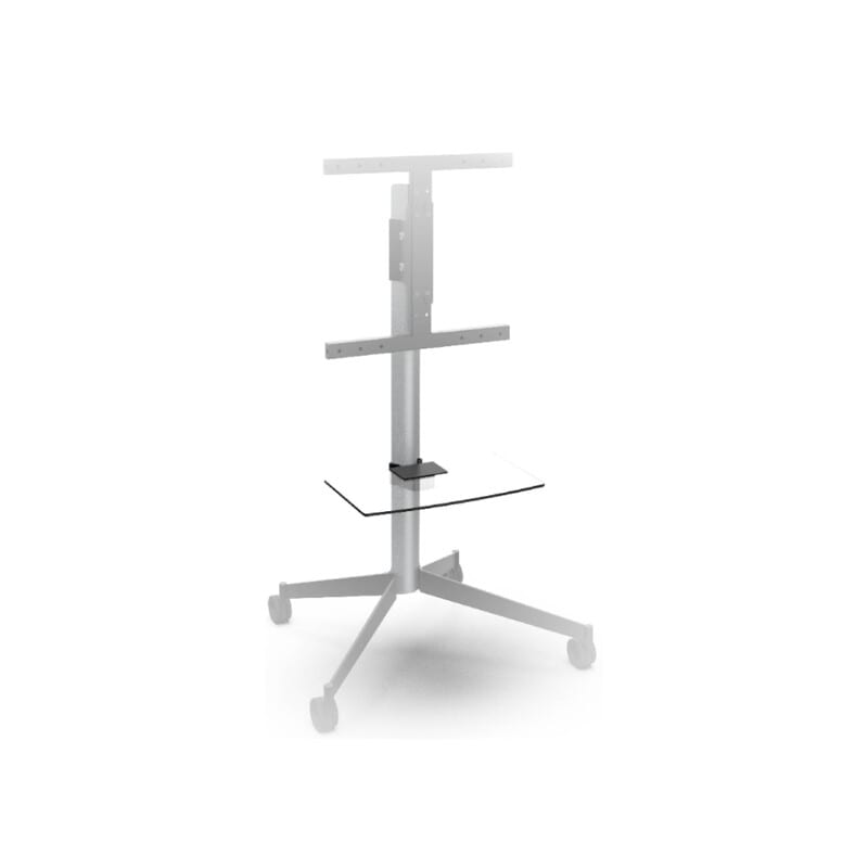 Siro lasihylly Erardin KANA -lattiajalustaan. Hyllylle voi sijoittaa oheistarvikkeita, kuten erilaisia AV-laitteita ja kaukosäätimiä.