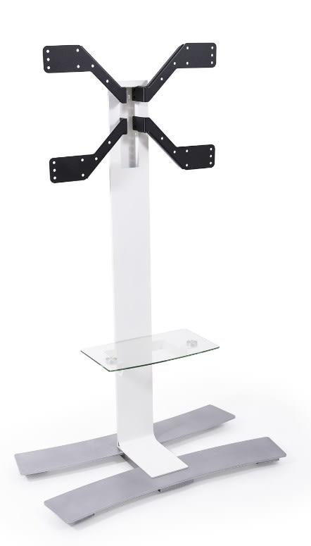 Tyylikäs, valkoinen lattiajalusta hyllyllä ja kääntyvillä pyörillä. Jalustan avulla näyttösi tai televisiosi liikuttaminen tilasta toiseen on nopeaa ja kätevää. Jalustan lasihyllyyn sijoitat näppärästi haluamasi oheistarvikkeet (esim. kaukosäädin, esitteitä).