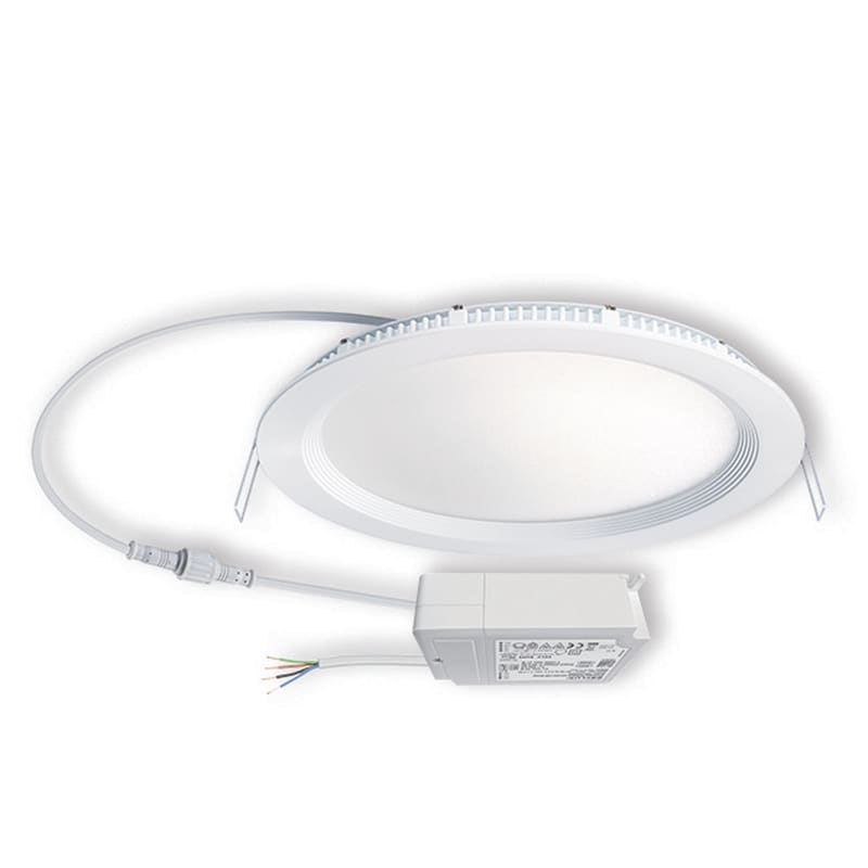 LED-Downlight-kohdevalaisin, 18W, kattoupotukseen Kattoon upotettava valaisin, jossa on opaali suojus (diffuusori) Korkealaatuinen kotelo, valaisimen runko alumiinia, valkoinen jauhepinnoite (RAL 9003) Voidaan asentaa katon sisään ilman muita varusteita Värilämpötila: 3000 K, vähäinen väripoikkeama Valovirta: 1750 lm Hyvä valon laatu Erittäin hyvä järjestelmän teho Valaisimen elinikä L80B50: 40,000 h Käyttölaite: DALI SwitchDIM (sisältyy toimitukseen)