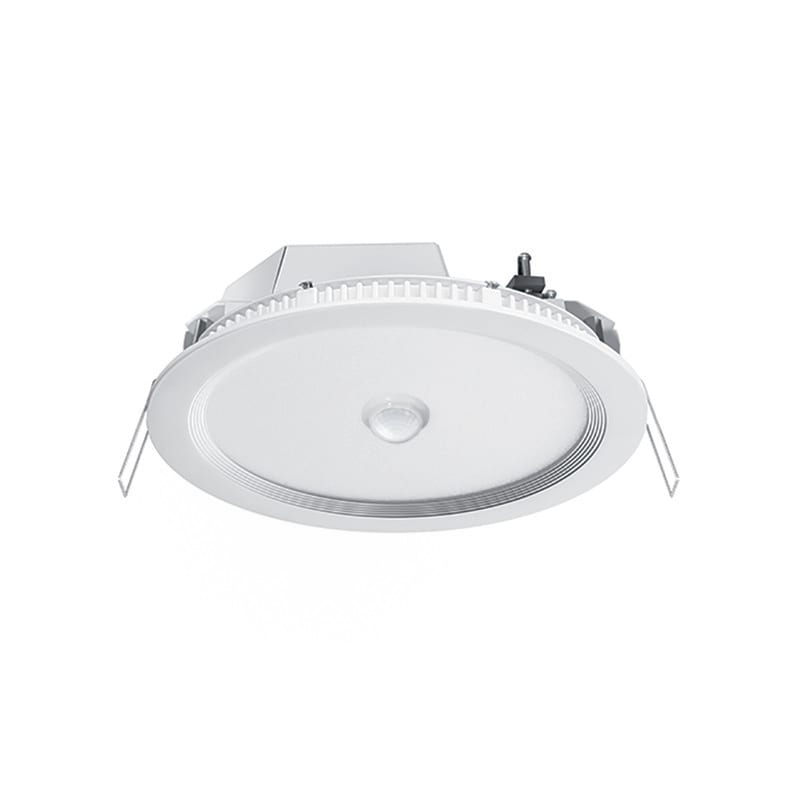 LED-Downlight-kohdevalaisin, 18 W, kattoupotukseen. Kattoon upotettava valaisin, jossa on opalisoiva suojus (diffuusori). Korkealaatuinen kotelo, valaisimen runko alumiinia, valkoinen jauhepinnoite (RAL 9003). Voidaan asentaa katon sisään ilman muita varusteita. Värilämpötila: 4000 K, vähäinen väripoikkeama. Valovirta: 1750 lm. Valaisimen elinikä L80B50: 40000 h. Käyttölaite: on/off (sisältyy toimitukseen). Integroitu COMPACT MINI -liikeilmaisin, jossa on 360°:n. Tunnistusalue. Halkaisijaltaan jopa 8 m:n tunnistusetäisyys 3 m:n suositellussa asennuskorkeudessa (suurin sallittu asennuskorkeus 5 m) käytettäväksi pieniin tiloihin ja vain vähän tai ei lainkaan päivänvaloa saaville läpikulkualueille. 16 A:n korkeatehorele (wolframi-alkukontakti), soveltuu erityisesti kapasitiivisten kuormitusten kytkemiseen, kuten LED-valaisimille. Kiinteästi tallennettu tehdasohjelma takaa välittömän käyttövalmiuden. Helppo ohjelmoida kaukosäätimellä. Tunnistusalueen laajennus kork. 8 ilmaisimen rinnankytkennällä.