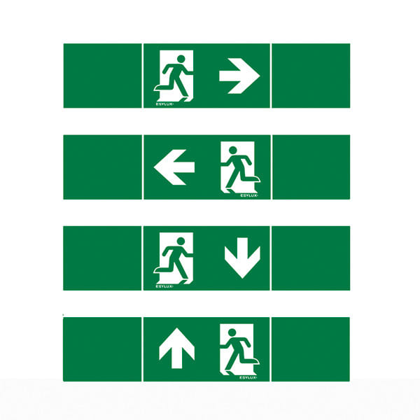 Symbolisarja SLA-sarjan yksiparistoisille hätävaloille Sarja sis. 4 symbolikalvoa, joiden havaintoetäisyys on 14 m (DIN/EN) (nuoli oikealle ylös, vasemmalle ylös, oikealle alas ja vasemmalle alas)