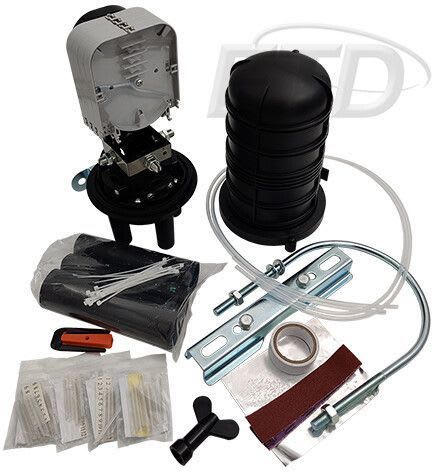 Jatkoskotelo CCDC 48f Dome Jatkoskotelo 48 kuidulle. Pakkaus sisältää läpivientien kutisteet, jatkosholkit, pylväskiinnikkeen ja muut asennustarvikkeet.