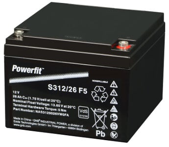 Powerfit S312/26 F5(faston F-M5)on 5 vuoden suljettu agm-akkupaikalliskäyttöön.12V/26Ah