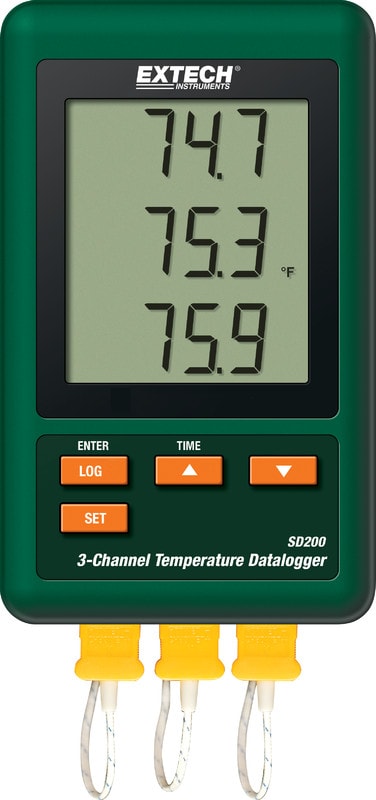 Extech SD200 3-kanavainen lämpötiladataloggeri tallentaa mittausarvot SD-muistikortille Excel luettavassa formaatissa.