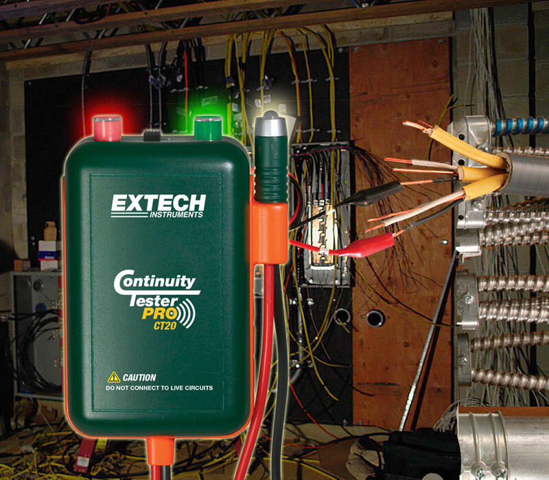 Extech CT20: Kaapelinhakulaite/Jatkuvuustesteri lähettimellä ja vastaanottimella. CT20 mahdollistaa helpon kaapelinhaun myös yksin työskenneltäessä: Erillisen lähettimen ja vastaanottimen avulla käyttäjän on helppo tunnistaa ja merkitä kaapeli vaikka kaapelin päät sijaitsisivat eri tiloissa. Testattavien kaapeleiden maksimi pituus on 3000 metriä. Lähettimen avulla jatkuvuustestaus ja kaapeleiden tunnistaminen voidaan tehdä samanaikaisesti kahdelle tai useammalle kaapelille kerrallaan.