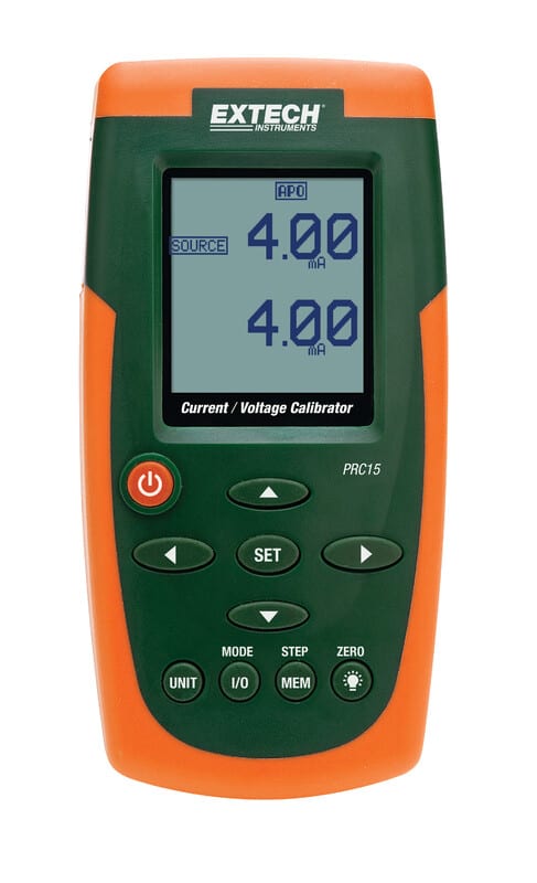 Extech PRC15: Virta- ja jänitekalibraattori/mittarilla testaat ja kalibroit monia eri prosessinohjauslaitteita ja instrumentteja kuten lähittimet, muuntimet, indikaattorit, tunnistimet, robottijärjestelmät, termoparit ja muut teollisuuden eri järjestelmien komponentit.