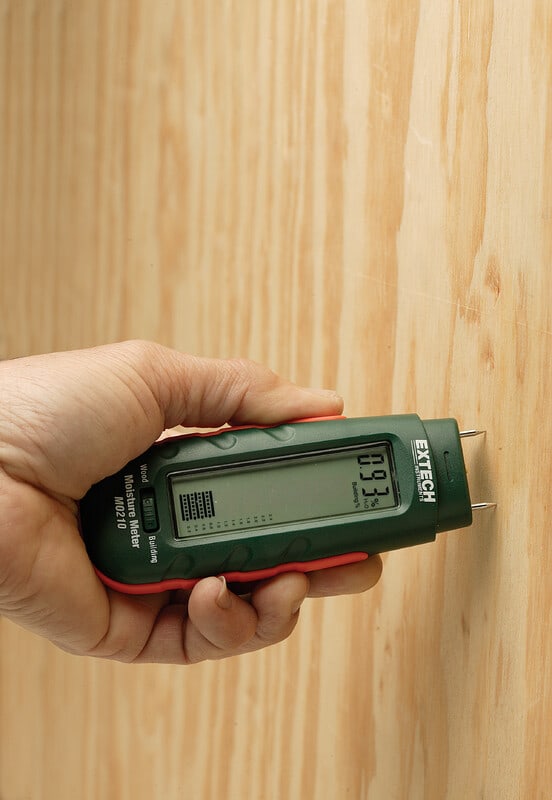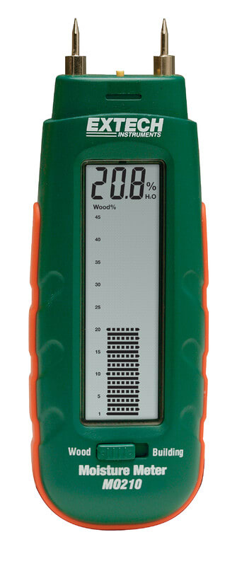 Extech MO210: Taskukokoinen piikillinen kosteusmittari LCD näytöllä, jossa myös pylväsnäyttö. MO210 avulla mittaat ja arvioit nopeasti onko puu tai muu huokoinen materiaali kärsinyt kosteusvahinkoja. Mittaa erilaisten rakennusmateriaalien kosteus (esim. seinä- ja kipsilevyt, kartongit, rappaukset ja laastit) painamalla elektrodipiikit mittattavaan pintaan ja mittari havaitsee kosteuden 0.2 - 2.4 % väliltä. Vaihda materiaalivalinta asetus puuhun ja paina elektrodipiikit puunpintaan, jolloin mittari havaitsee puussa olevan kosteuden 6% - 44 % väliltä.