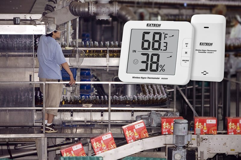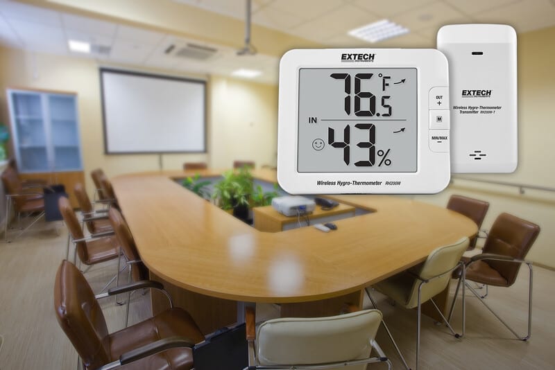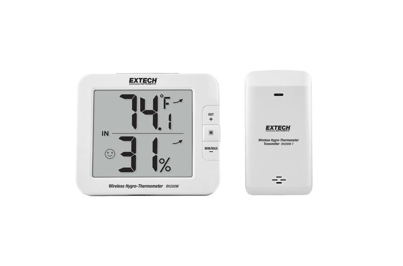 Extech RH200W: Langaton kosteus- ja lämpömittari useiden tilojen samanaikaiseen valvontaan esimerkiksi ravintoloissa, tehtaissa, toimistoissa, kotona ja varastorakennuksissa. RH200W on langaton monikanavainen kosteus- ja lämpömittari sisätilojen mittaukseen, johon on mahdollista yhdistää jopa 8 langatonta kosteus- ja lämpöanturia. Suuressa LCD näytössä on automaattinen yövalo ja ikonit jotka näyttävät mitattavan huoneen mukavuusolosuhteet. Trendinuoli näyttää mittausarvojen nousun, laskun tai tasaisuuden.
