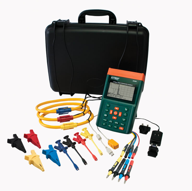 Extech PQ3350-3: Dataloggaava analysaatori 1- ja 3-vaihe/johdin sekä 3-vaihde/4-johdin järjestelmien analysointiin. Mukana tulevat joustavat virtalenkkianturit menevät helposti virtakiskojen ja johtonippujen ympärille, helpottaen mittausta. Suuri taustavalaistu LCD näyttö näyttää jopa 35 eri parametriä yhtäaikaisesti.