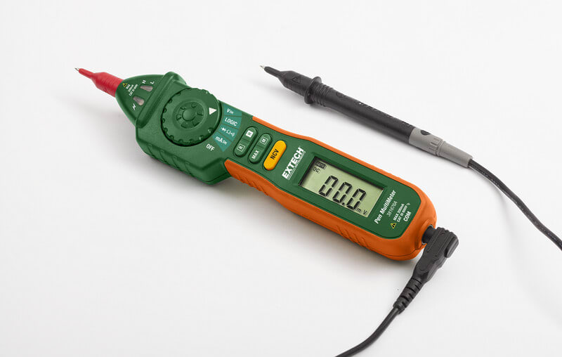 Extech 381676A: 9-toiminnon kynäyleismittari kosketuksettomalla jännitteenkoettimella. 381676A on sekä automaattisella, että manuaalisella mittausaluevalinnalla toimiva kynämallinen yleismittari jota on helppo käyttää myös yhdellä kädellä.