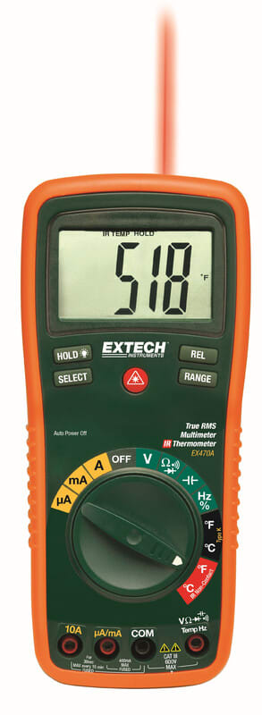 EX470A on 12 toiminnon ammattikäyttöön tarkoitettu digitaalinen TRMS yleismittari integroidulla infrapunalämpömittarilla, automaattisella aluevalinnalla, K-tyypin lämpötila-anturilla sekä suurella LCD näytöllä.