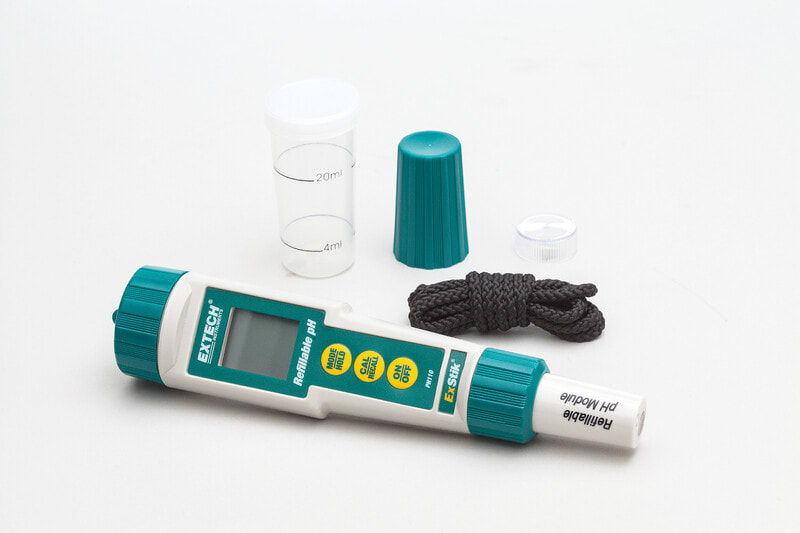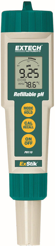 ExStik® PH110 pH-mittari on vedenkestävä, tarkka ja uudelleen täytettävä pH-mittari. Tasakärkinen elektrodi mahdollistaa nesteiden, puolikiinteiden aineiden ja kiinteiden aineiden pH mittauksen, sekä vähentää elektrodin rikkoutumisen ja tukkeutumisen riskiä.