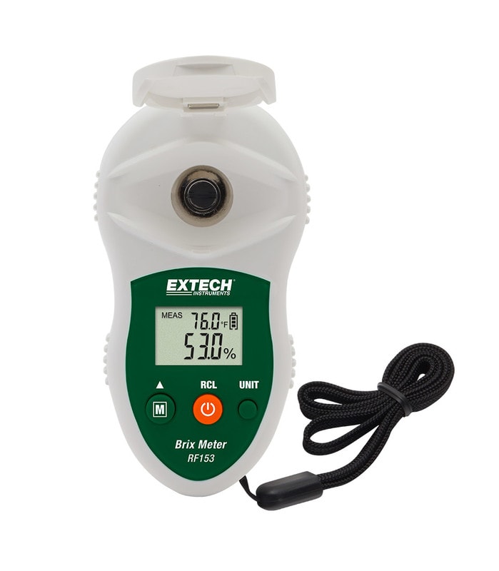Extech RF153: Digitaalinen Brix refraktometri mittaa nopeasti ja tarkasti nesteiden sokeripitoisuuden. Juoma-, ja ruokateollisuuteen sekä teollisuuden erilaisten laimennettujen nesteiden pitoisuuksien valvontaan (jäähdytinnesteet, hydraulinesteet ja jäänestoaineet). RF153 refraktometrissä on nopea 3 sekunnin vasteaika, LCD näyttö ja se esittää Brix %:n tai taitekerroinindeksin (RI), sekä lämpötilan. Kämmeneen hyvin istuva koko ja sisäänrakennettu lämpötilan automaattinen kompensointi (ATC), prisma-anturin suojaläppä sekä 10 lukeman muisti. IP65 vedenkestävä kotelointi.