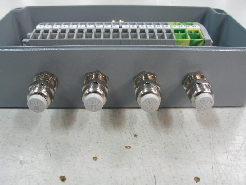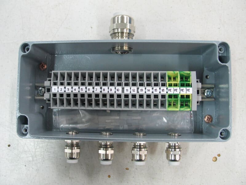Kotelo sisältää koosta riippuen 4-16 kpl kaksinapaisia jousivoimaliittimiä antureille ja maadoitusliittimet sekä holkkitiivisteet. IP66.