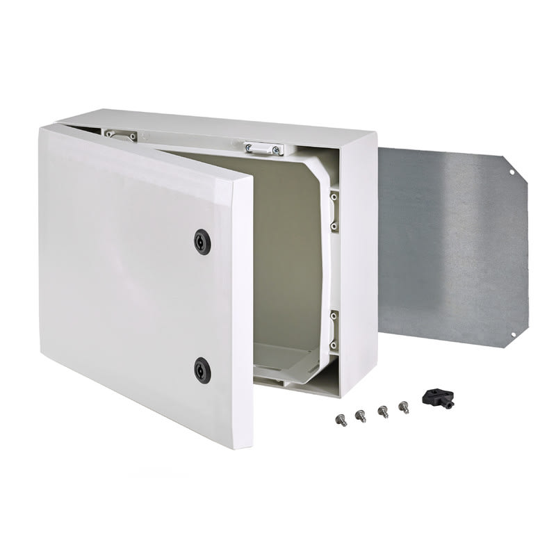 Sisältää : Kaapin alaosa, ovi PUR tiivisteellä, asennuslevy, ruuvit asennuslevylle. 3mm kaksoislehtilukko(t) avaimella. S versiot kääntökahvalla. Oviohjain sisältyy. IP66; IK10