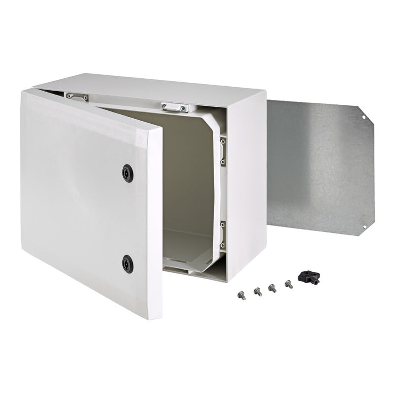 Sisältää : Kaapin alaosa, ovi PUR tiivisteellä, asennuslevy, ruuvit asennuslevylle. 3mm kaksoislehtilukko(t) avaimella. S versiot kääntökahvalla. Oviohjain sisältyy. IP66; IK10