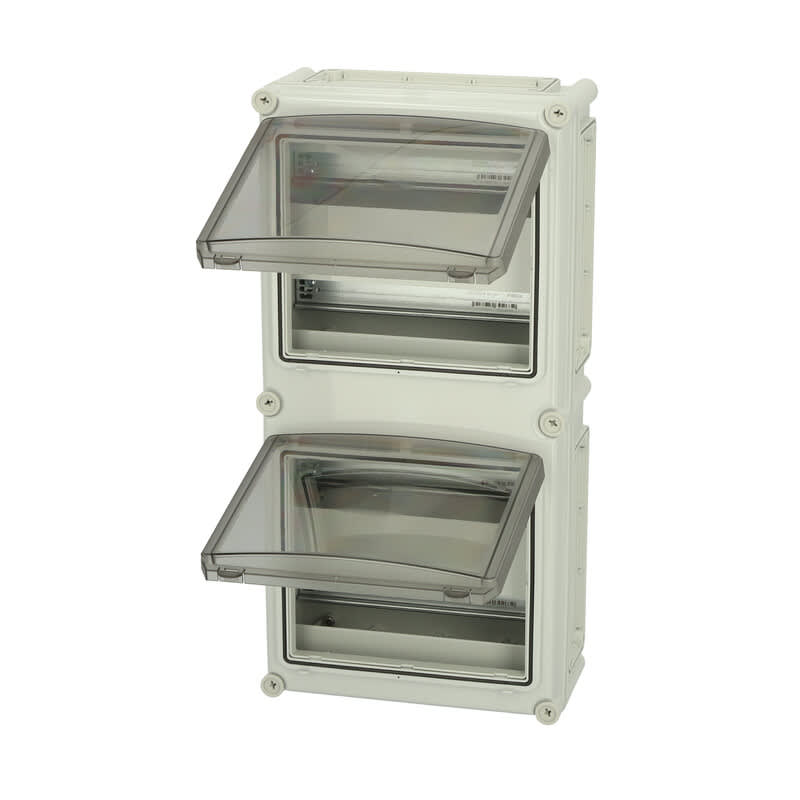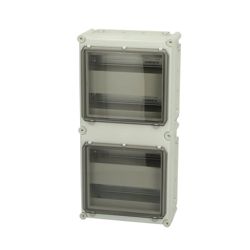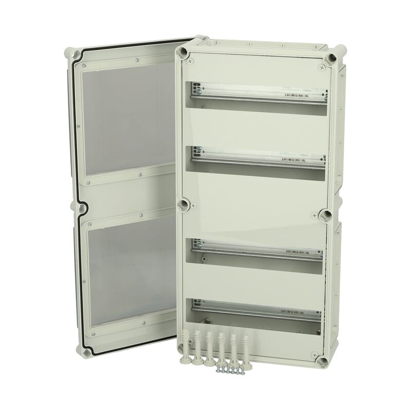 Sisältää : Laippa-aukollinen alaosa, ruuvit asennuslevylle, kansi PUR-tiivisteellä ja polyamidi kansiruuveilla. Sisältää DIN-kiskojärjestelmän. Kahdella tarkistusluukulla. IP65; IK08