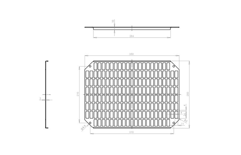 MPP, Mounting Plate Perforated, Asennuslevy, perforoitu, 350x250x2, kaapin koolle 400x300x150/210, Galvanoitu teräs, perforoinnin koko 26x11 mm, ei sisällä asennusruuveja