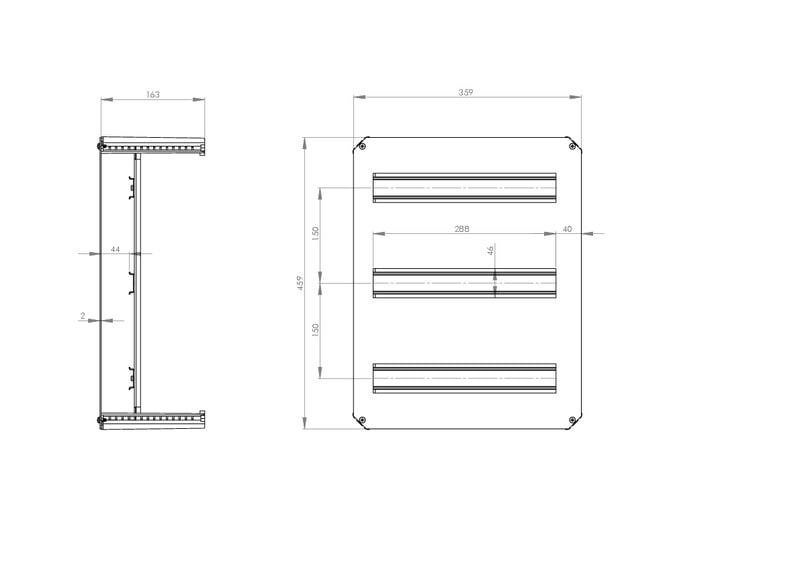 DRS, Din Rail frame Set, DIN-kiskokehyssarja, 3 riviä x 16 modulia, ARCA kaappikoolle 500x400x210