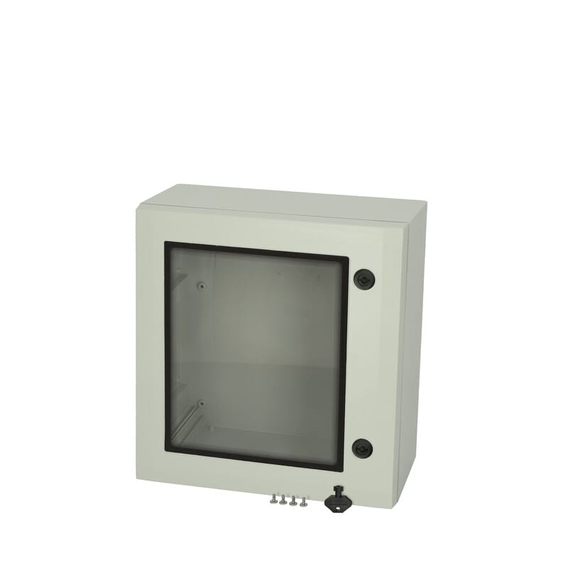 Polykarbonaatti-kaappi, 500x500x210, Harmaa ovi ikkunalla, 2-pistelukitus avaimella, saranat lyhyellä sivulla, Ruuvit asennuslevylle, Ei sisällä asennuslevyä, IP65, IK08