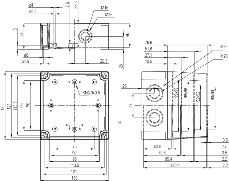 MNX PCM polykarbonaattikotelo, 130x130x125, metriset läpilyöntiaihiot, harmaa, alaosa TPE-tiivisteellä, 4 kpl ruuvit asennuslevylle/DIN-kiskolle, 4 kpl polyamidi kansiruuvia, IP66/67, IK08