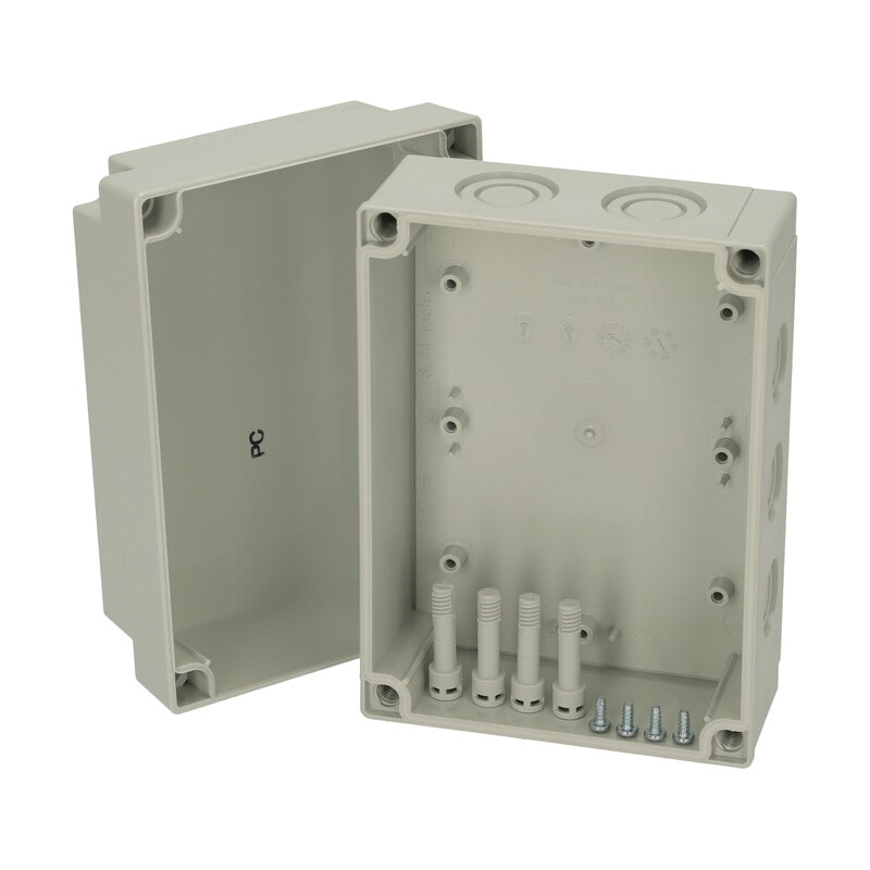 MNX PCM polykarbonaattikotelo, 180x130x100, metriset läpilyöntiaihiot, harmaa, alaosa TPE-tiivisteellä, 4 kpl ruuvit asennuslevylle/DIN-kiskolle, 4 kpl polyamidi kansiruuvia, IP66/67, IK08
