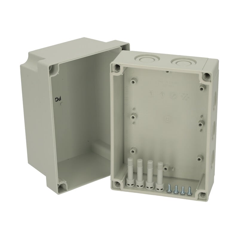 MNX PCM polykarbonaattikotelo, 180x130x125, metriset läpilyöntiaihiot, harmaa, alaosa TPE-tiivisteellä, 4 kpl ruuvit asennuslevylle/DIN-kiskolle, 4 kpl polyamidi kansiruuvia, IP66/67, IK08