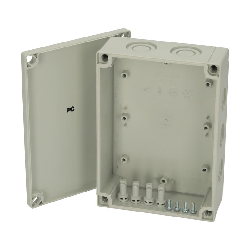 MNX PCM polykarbonaattikotelo, 180x130x60, metriset läpilyöntiaihiot, harmaa, alaosa TPE-tiivisteellä, 4 kpl ruuvit asennuslevylle/DIN-kiskolle, 4 kpl polyamidi kansiruuvia, IP66/67, IK08