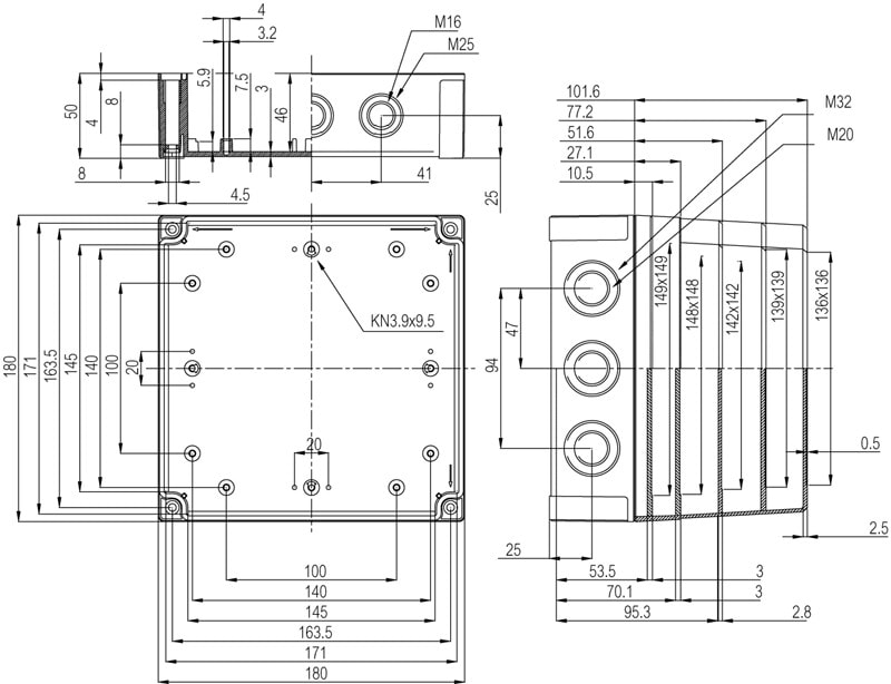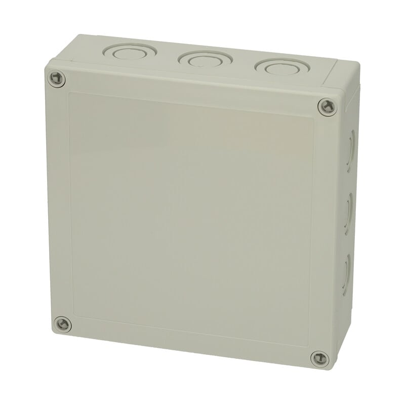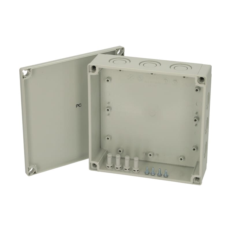 MNX PCM polykarbonaattikotelo, 180x180x60, metriset läpilyöntiaihiot, harmaa, alaosa TPE-tiivisteellä, 4 kpl ruuvit asennuslevylle/DIN-kiskolle, 4 kpl polyamidi kansiruuvia, IP66/67, IK08