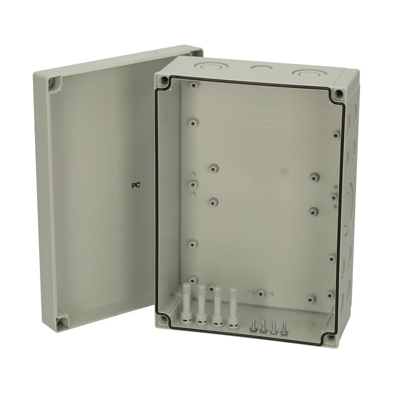 MNX PCM polykarbonaattikotelo, 255x180x100, metriset läpilyöntiaihiot, extra korkea alaosa, harmaa, alaosa PUR-tiivisteellä, 4 kpl ruuvit asennuslevylle/DIN-kiskolle, 4 kpl polyamidi kansiruuvia, IP66/67, IK08