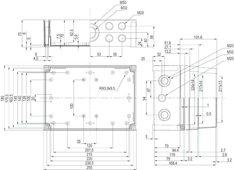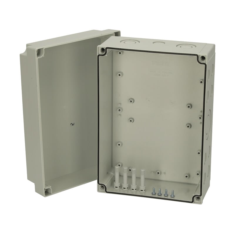 MNX PCM polykarbonaattikotelo, 255x180x125, metriset läpilyöntiaihiot, extra korkea alaosa, harmaa, alaosa PUR-tiivisteellä, 4 kpl ruuvit asennuslevylle/DIN-kiskolle, 4 kpl polyamidi kansiruuvia, IP66/67, IK08
