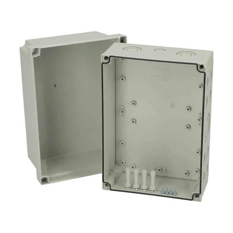 MNX PCM polykarbonaattikotelo, 255x180x175, metriset läpilyöntiaihiot, extra korkea alaosa, harmaa, alaosa PUR-tiivisteellä, 4 kpl ruuvit asennuslevylle/DIN-kiskolle, 4 kpl polyamidi kansiruuvia, IP66/67, IK08