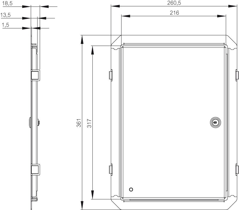 IDS, Inner Door Set, Sisäovisarja, 385x285x35, kaapin koolle 400x300x150/210, Galvanoitu teräs ja alumiini, lukittava ja sisältää avaimen, RAL 7035