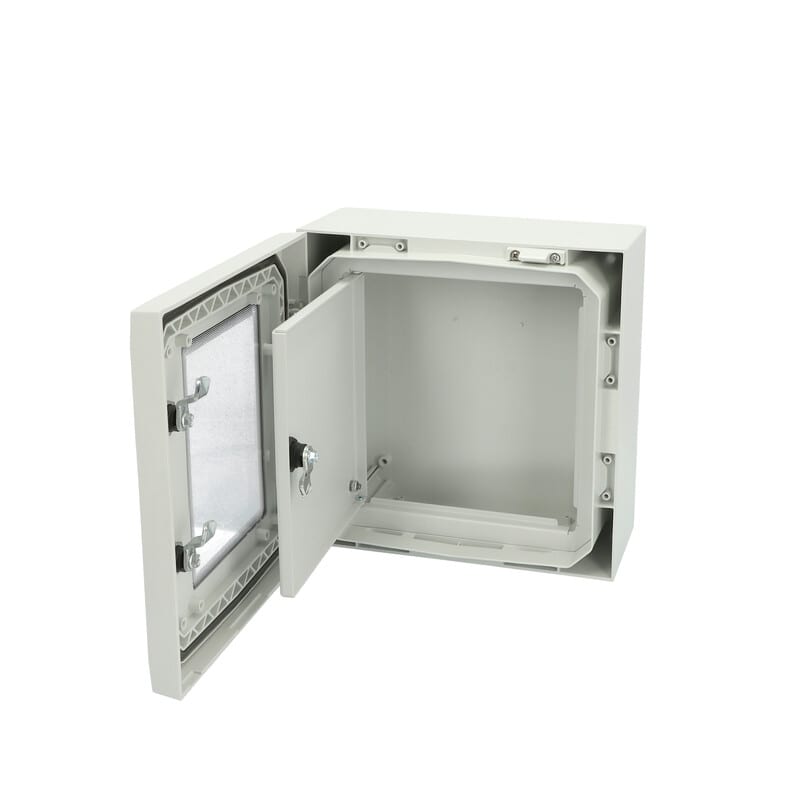 Lisätieto : Raamit galvanoitua terästä, ovi alumiinia, RAL 7035, kaapin koolle 300x300x210