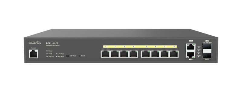 EnGenius Cloud ECS1112FP on 8-porttinen Gigabit PoE+ Layer 2+ kytkin 130W PoE-teholla. Lisäksi siitä löytyy 2x 2 GbE ja 2 Dual-Speed SFP-portit.