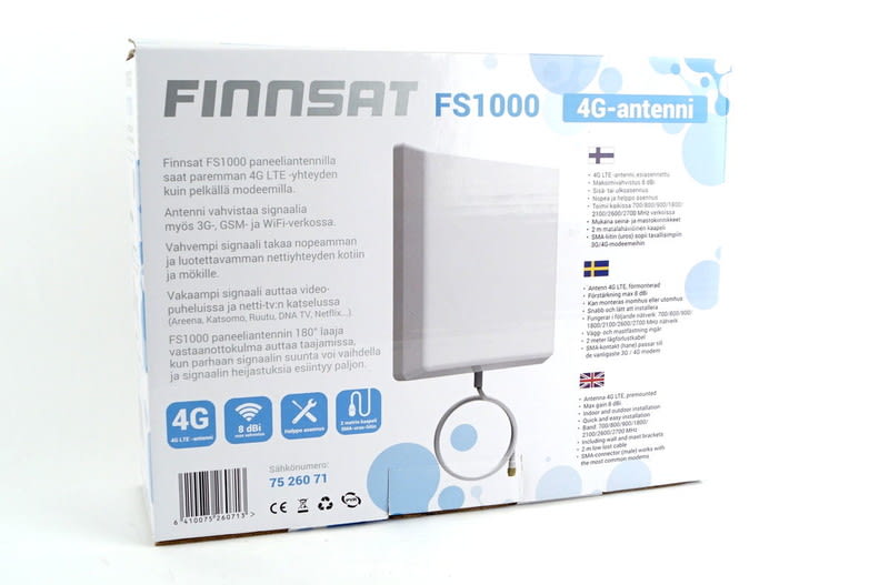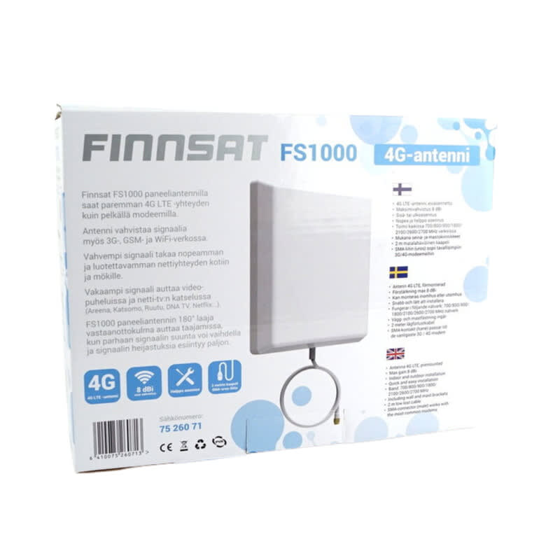 FS1000 -antenni on suunniteltu Suomen matkapuhelin- ja dataverkkoihin 4G/GSM/CDMA/PC3/3G/WLAN. Antennia voidaan käyttää sekä sisällä että ulkona, koska se on valmistettu UV-kestävästä teknisestä ABS-muovista. Mukaan toimitetaan kiinnikkeet, joilla antenni voidaan helposti asentaa sekä mastoputkeen että seinään. Kompaktista koostaan huolimatta vahvistus on koko taajuusalueella 6-9 dBi.