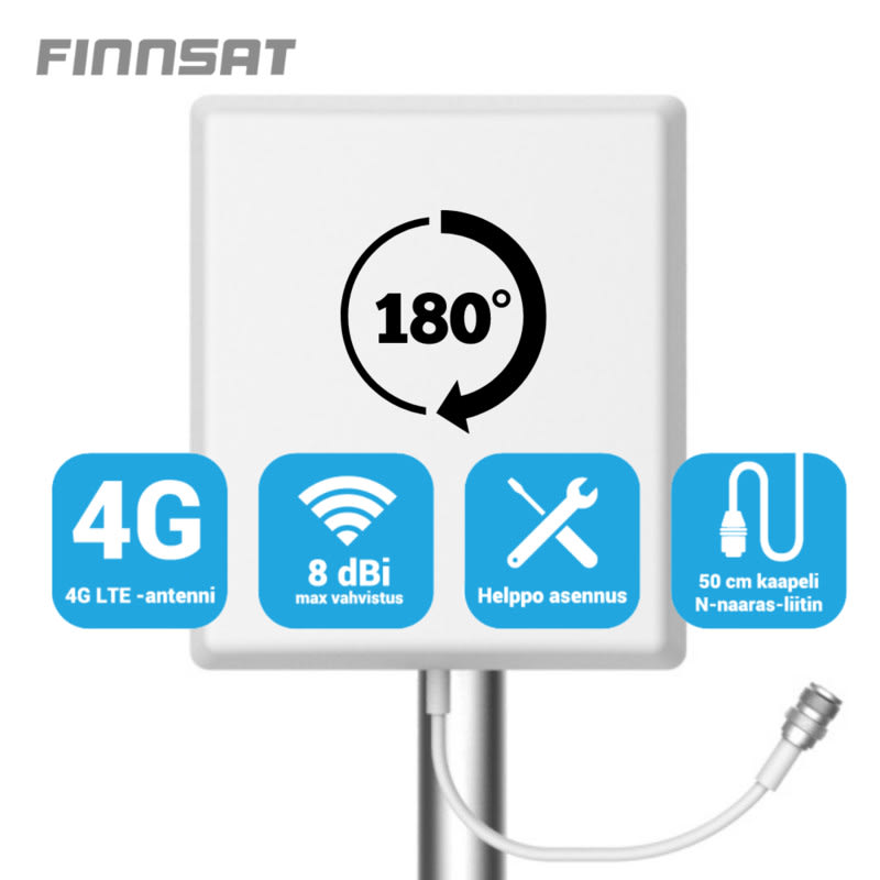 Finnsat FS1000-N paneeliantennilla saat paremman 4G LTE -yhteyden kuin pelkällä modeemilla. FS1000-N paneeliantennin 180° laaja vastaanottokulma auttaa taajamissa, kun parhaan signaalin suunta voi vaihdella ja signaalin heijastuksia esiintyy paljon.
