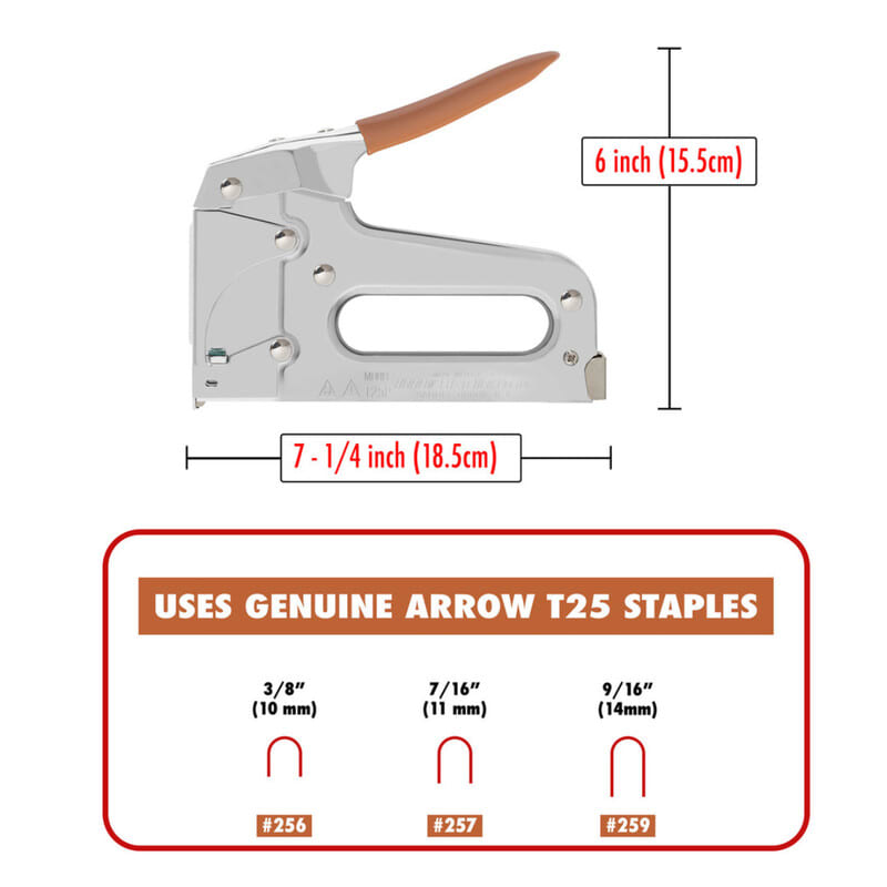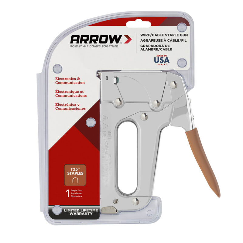 Sinkilänaulain Arrow T25 6-8mm kaapeleiden niiteille Ammattiasentajien suosikkityökalu T25 on Arrowin myydyin sinkilänaulain. Siinä on täysin kromattu teräsrunko, tukkeutumaton takakuormitusmekanismi, voimakas kierrejousi, pehmustettu kahva, uritettu lankaohjain suojaa johtoja vaurioilta ja kaareva terä jatkuvan nidonnan takaamiseksi. Täydellinen työkalu kaikille pienjännitekaapeleille.